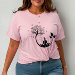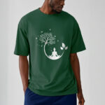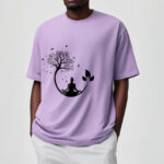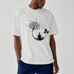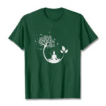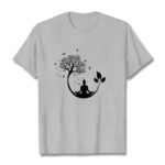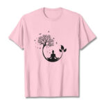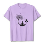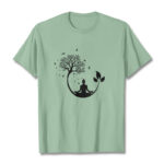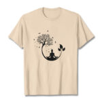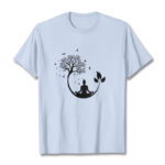 - DESIGN INSPIRATION: This T-shirt design features Buddha meditating in a tree. The branches extend upward, lush and leafy, and birds fly, adding to the sense of freedom and tranquility. There is a leaf outside the circle, perhaps symbolizing growth or new beginnings. These images symbolize inner peace, focus and self-reflection, representing a harmonious connection with nature and the universe.