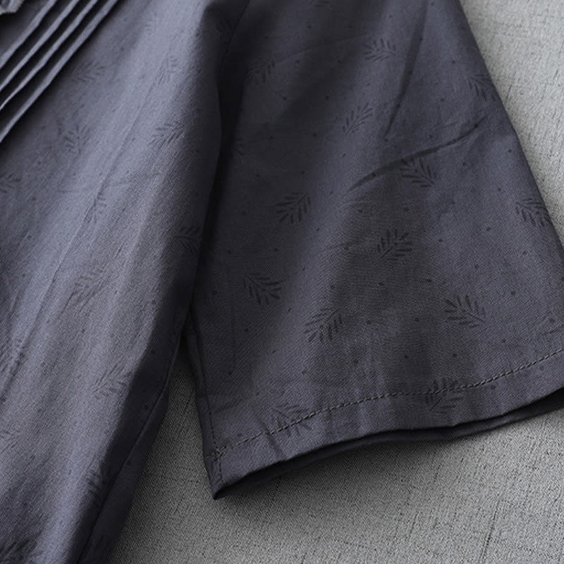 Buddha Stones Casual Retro Solid Color Button Ruffled Crew Neck Design Short Sleeve Cotton Linen Midi Dress With Pockets