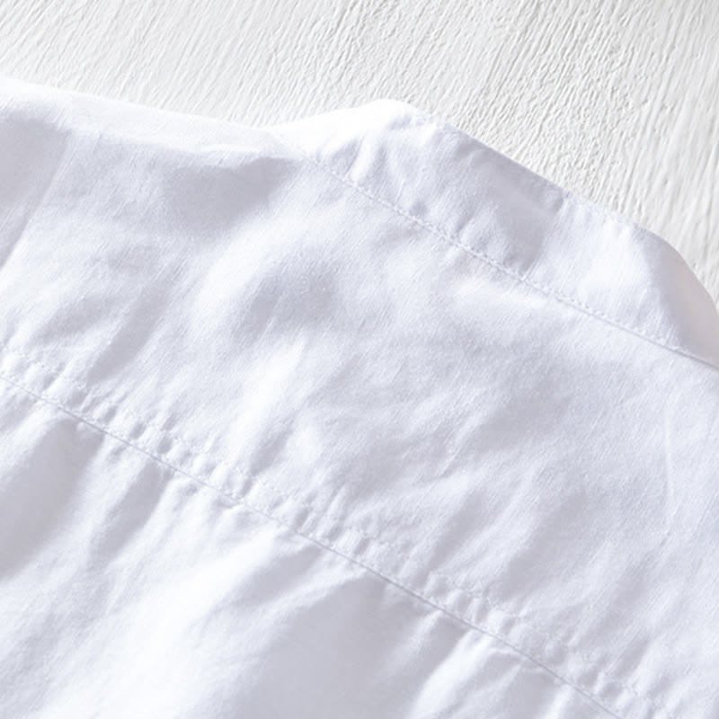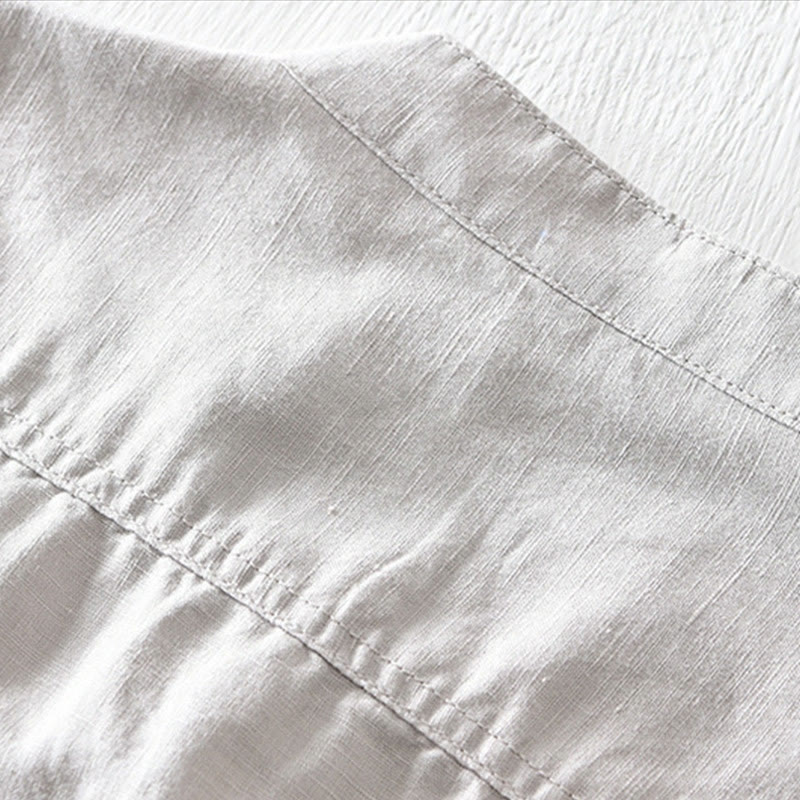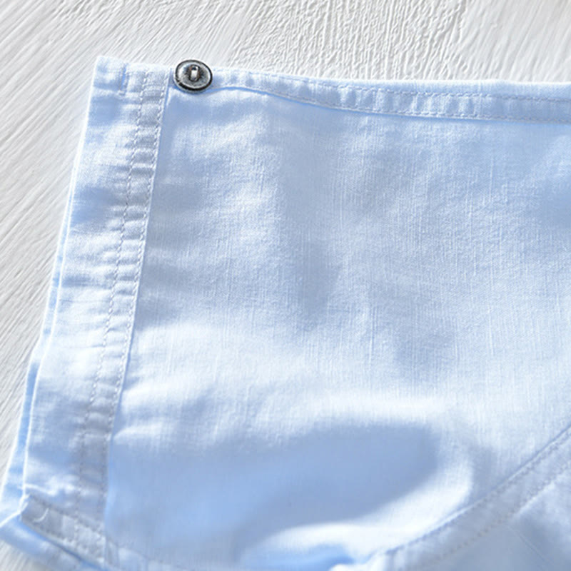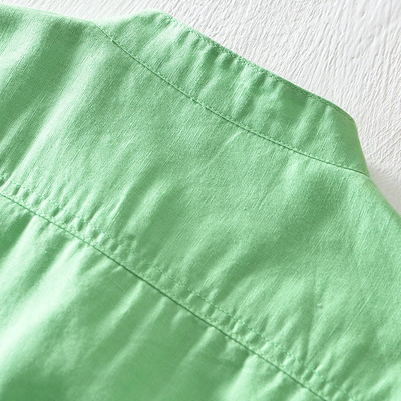 Buddha Stones Solid Color Half Button Design Stand Collar Men’s Short Sleeve Cotton Linen Shirt