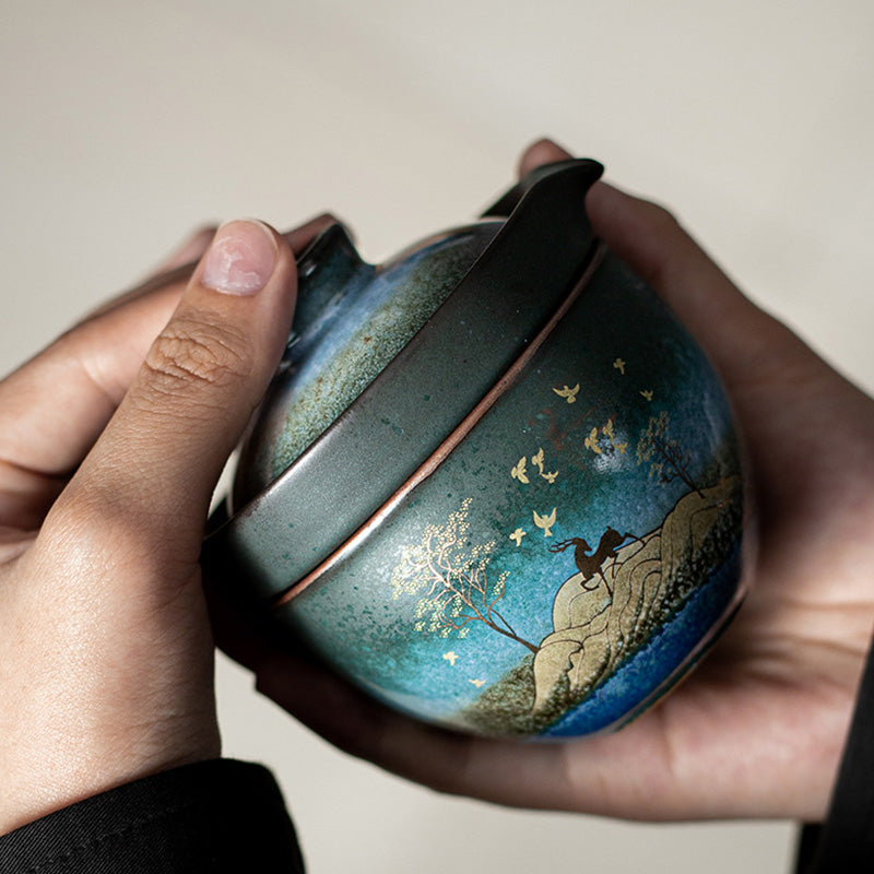 Buddha Stones Ceramic Teacup Deer Mountain Trees Lovely Cat Black Tea Cup With Lid and Bag