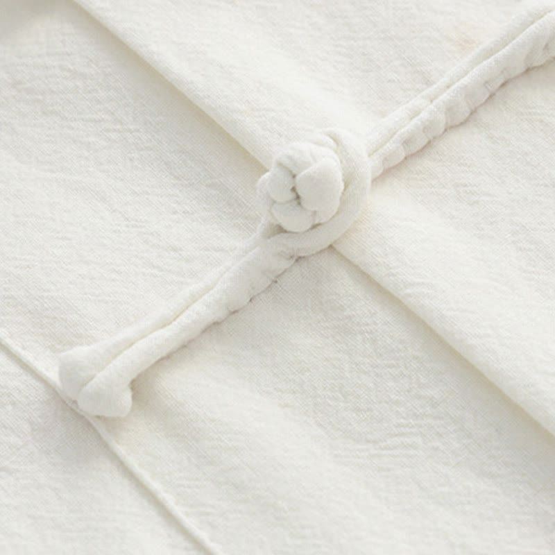 Chinese Frog-Button Linen shirt showcases pure white cotton and linen fabric, designed with traditional frog-button closures and practical pockets. This shirt emphasizes cultural elegance and simplicity with its classic design. The white color represents purity and calm, making it a timeless piece for those who appreciate heritage craftsmanship and understated sophistication. 💕