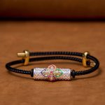 Copper Luck bracelet features a central silver-colored roller adorned with a floral design, where each petal is uniquely colored. This copper bracelet is crafted with a red string, symbolizing good fortune and protection. The intricate flower design is meant to bring balance and positive energy, while the red string represents vitality and strength.💕
