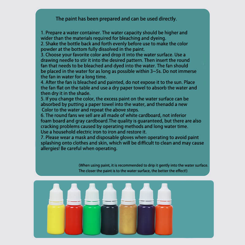 3. Choose your favorite color and drop it into the water surface. Use a drawing needle to stir it into the desired pattern. Then insert the round fan that needs to be bleached and dyed into the water. The fan should be placed in the water for as long as possible within 3~5s. Do not immerse the fan in water for a long time.