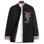 Dragon Embroidery Polyester Clothes crafted from durable polyester, this piece features a single, powerful dragon embroidered on the chest, symbolizing strength and protection. The frog-button closure offers a traditional touch, complemented by functional pockets for added utility. A meaningful garment that unites cultural essence with everyday functionality, this shirt-jacket combination is both comfortable and symbolic, ideal for those embracing tradition with a modern edge.
