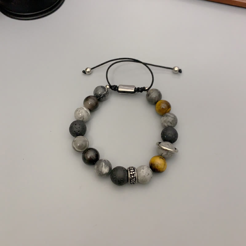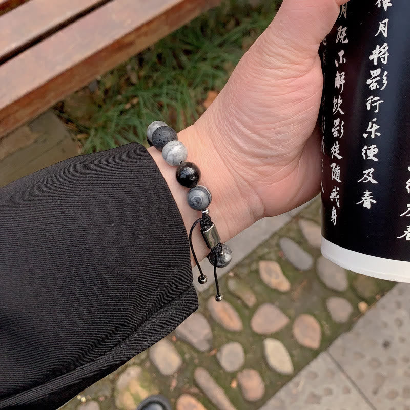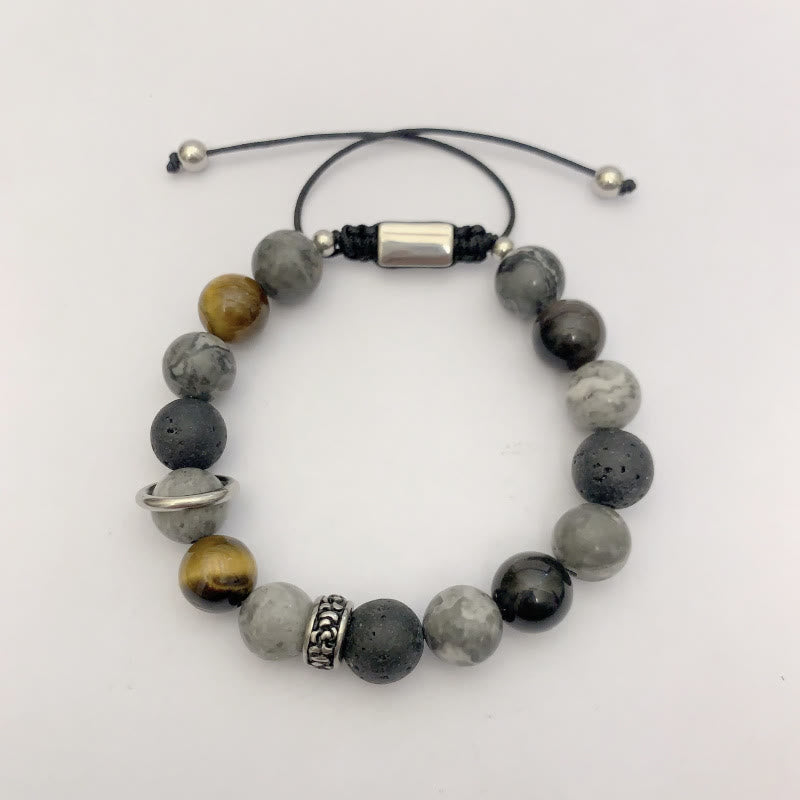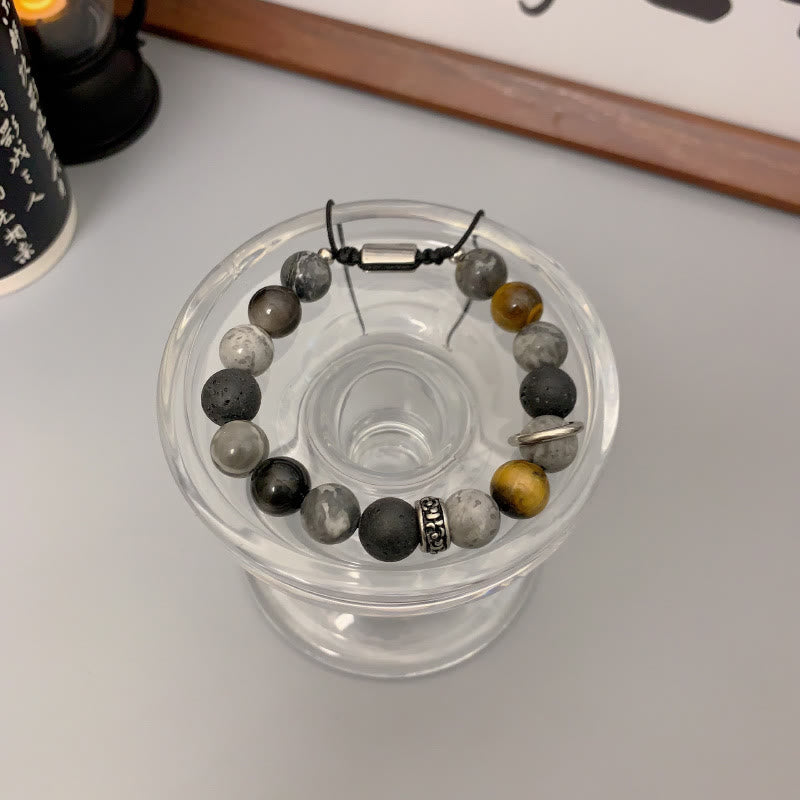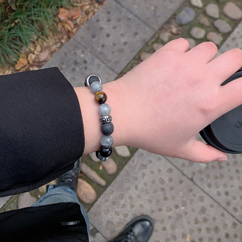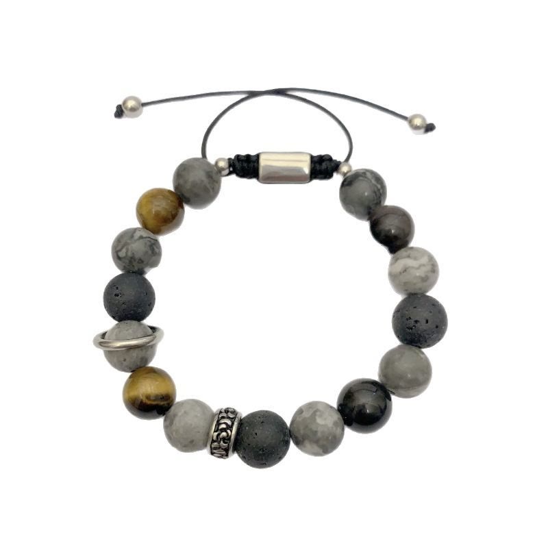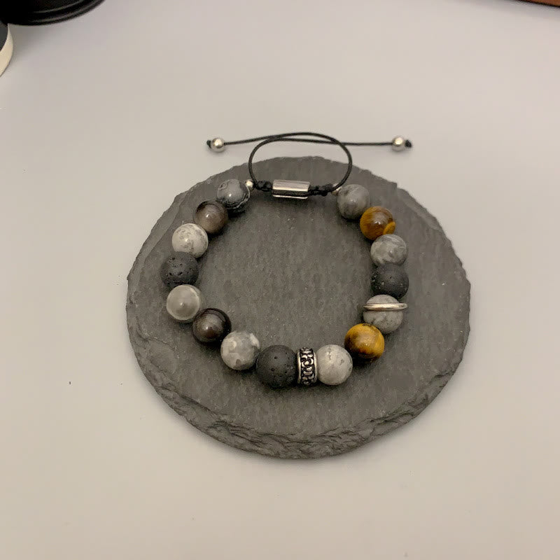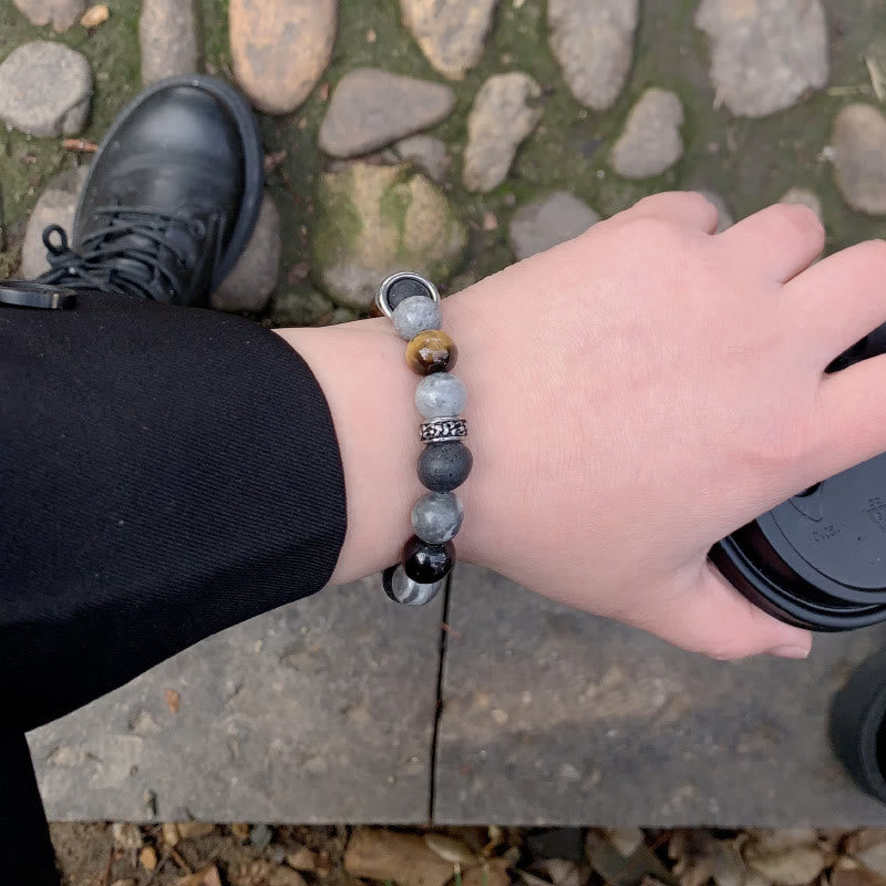 - Material: Grey Jasper, Lava Rock, Silver Sheen Obsidian, Tiger Eye, Stainless Steel, Rope