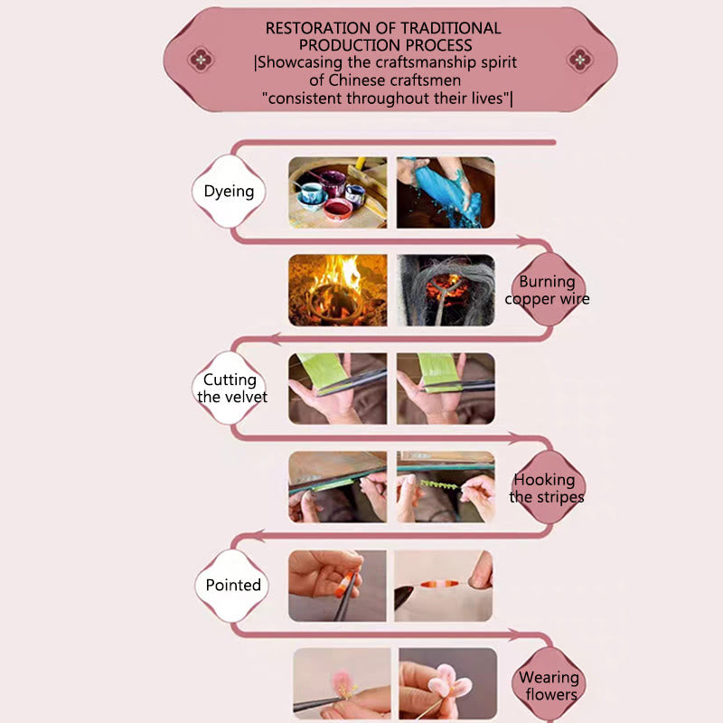 The popularity of Yangzhou velvet flowers can be traced back to 1,300 years ago. In spring, Li Xian, one of the Emperors of the Tang Dynasty, designated Yangzhou velvet flowers as imperial palace flowers to reward his beloved concubines. In ancient Yangzhou, the flower-making industry was very developed and it was a famous production area of craft flowers in China. Among the flower-making in Yangzhou, velvet flowers have the earliest history, the most varieties, and the greatest influence.