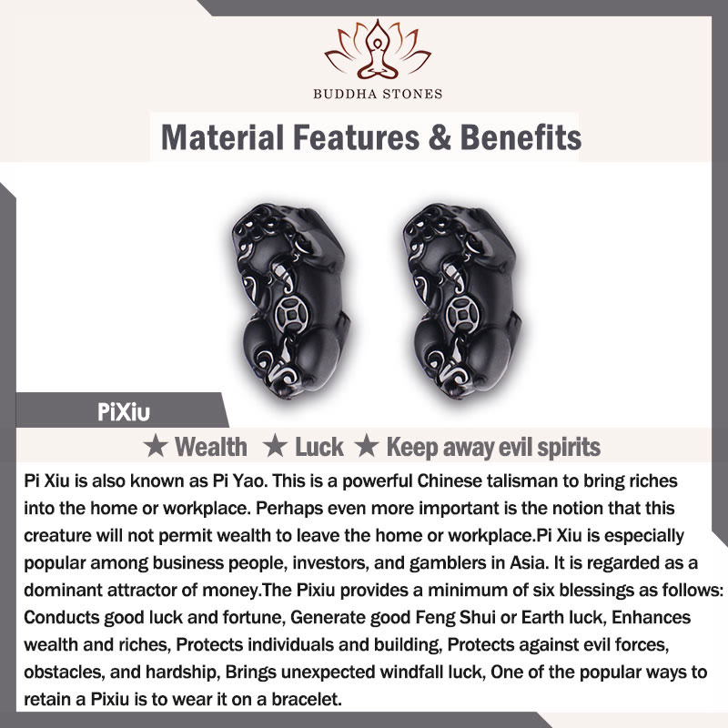 The Pixiu provides a minimum of six blessings as follows: Conducts good luck and fortune, Generate good Feng Shui or Earth luck, Enhances wealth and riches, Protects individuals and building, Protects against evil forces, obstacles, and hardship, Brings unexpected windfall luck, One of the popular ways to retain a Pixiu is to wear it on a bracelet.