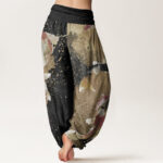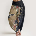- Design: This harem pants design feature a koi, gold ink background pattern. The koi’s scales are clearly visible, and its tail is flowing, symbolizing wealth, prosperity and good luck. The ink is unevenly distributed, creating a flowing and changing visual effect. The fluidity of the ink may symbolize the qualities of water, echoing the movement of the koi in the water. The overall atmosphere is harmonious and positive, perfect for adding a unique touch to your stylish collection.
