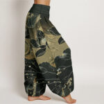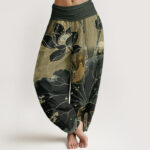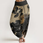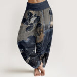 - Design: This harem pants shows a lotus pattern. The blooming lotus petals present an elegant curve, symbolizing purity and elegance. The edges of the lotus leaves are slightly broken and irregular in shape, which increases the dynamic and natural feeling of the picture. The overall style is pure and natural, which is very suitable for adding a unique touch to your stylish collection.