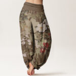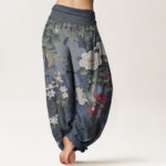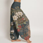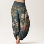 - Design: The harem pants feature peony flowers leaves and magpies. The peony blooms in the center of the picture, symbolize wealth and prosperity; the magpie perches on the branches, implying joy and good luck. Together, these elements form a scene full of vitality and beauty, making people feel the warmth and hope of spring. These elements make the pants not only fashionable but also full of meaning.
