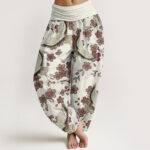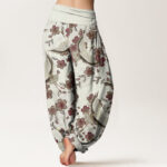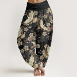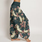 - Design: The Harem pants featuring Crane and peach blossom patterns combine symbols of longevity and good fortune with those of love, beauty, and prosperity, as cranes represent long life and peach blossoms signify romance and auspicious beginnings. This design embodies a harmonious blend of cultural and natural motifs, celebrating life’s abundance and harmony.