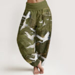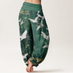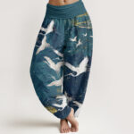 - Design: This harem pants design features flying white cranes and auspicious clouds, symbolizing longevity, spiritual transcendence, and good fortune. The white cranes represent purity, wisdom, and a connection between heaven and earth, while the clouds signify heavenly blessings and cosmic harmony.