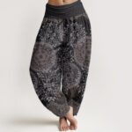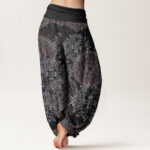 - Design: This harem pants design features a mandala-inspired pattern, with large circular motifs surrounded by intricate, symmetrical details. The geometric shapes within the circles, combined with delicate floral and leafy elements, create a harmonious and balanced look, offering a blend of structure and organic flow.