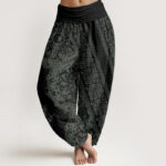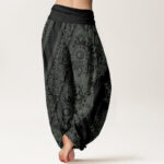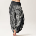 - Design: This harem pants design features an intricate, mandala-inspired pattern that wraps around the fabric. The large, circular motifs at the center are surrounded by delicate, symmetrical floral elements, creating a sense of balance. The design is both bold and refined, with geometric shapes blending seamlessly with organic details for a visually striking look.
