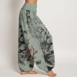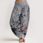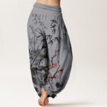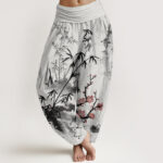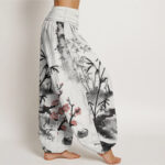 Plum Blossoms Bamboo Harem Pants feature an elegant ink-painting design of plum blossoms, bamboo, orchids, and chrysanthemums. These motifs symbolize resilience, grace, and harmony with nature. Crafted from lightweight fabric with an elastic waistband, these pants provide comfort and flexibility. The artistic patterns inspire mindfulness and a deeper connection to nature’s beauty and balance.💕