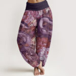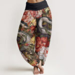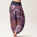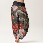 - Design: The harem pants feature snake peony flowers and leaf patterns. Snakes are often seen as symbols of wisdom, spirituality and transformation in traditional Chinese culture, representing the cycle and regeneration of life. Peonies symbolize wealth, prosperity and beauty. When snakes are wrapped around the peony, it is a combination of wisdom and beauty, suggesting that in the pursuit of a better life, wisdom and courage are needed to face the challenges in life. These elements make this pair of pants not only fashionable but also full of meaning.