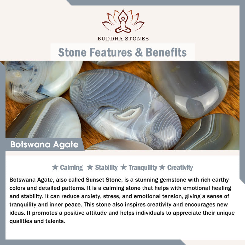 Botswana Agate, also called Sunset Stone, is a stunning gemstone with rich earthy colors and detailed patterns. It is a calming stone that helps with emotional healing and stability. It can reduce anxiety, stress, and emotional tension, giving a sense of tranquility and inner peace. This stone also inspires creativity and encourages new ideas. It promotes a positive attitude and helps individuals to appreciate their unique qualities and talents.