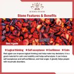 Red agate can improve logical thinking and help make key decisions. It is a good material for calm and stability and helps self-analysis. It can induce self-acceptance and self-confidence, and heal anger. It greatly helps people with traumatic disorders.