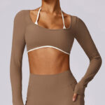 Buddha Stones Solid Color Halter Neck Bra Long Sleeve Crop Tank Top Pants Sports Fitness Gym Yoga Outfits