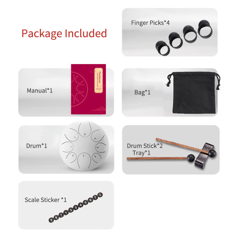 - Package: Manual*1, Scale Sticker *1, Drum Stick*2, Tray*1, Bag*1, Drum*1, Finger Picks*4