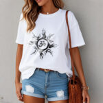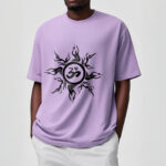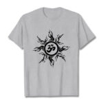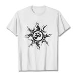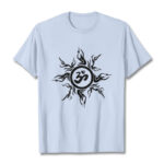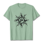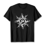 • DESIGN INSPIRATION: This T-shirt design features a stylized sunburst pattern surrounding an “Om” symbol at its center. The sunburst radiates outward with dynamic, flame-like rays, creating a sense of energy and vitality. The “Om” symbol, central to Hinduism and other Eastern spiritual traditions, represents the primordial sound of creation and the essence of the universe. This combination of elements symbolizes the balance between energy and tranquility, embodying spiritual harmony and the interconnectedness of all things.