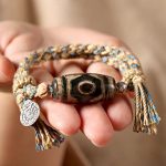 Dzi bead (Tib. གཟི།; pronounced “zee”; alternative spelling: gzi) is a type of stone bead of uncertain origin worn as part of a necklace and sometimes as a bracelet. Dzi beads are precious jewelry from Tibetan culture which is generally prized as protective amulets,these beads are believed to attract local protectors, dharmapalas or deities or maybe beneficial ghosts, ancestors or even bodhisattvas. Because of this, dzi beads are always treated with respect in Tibetan culture. Nine-Eye Dzi Bead is the symbol of The Nine Planets, It includes the activity of the Universe and the wisdom of the humanity. Nine-eyed beads is the most popular of all Dzis, brings all kinds of luck and blessings; protection, good health, purify negative energy expand intelligence and wisdom.It helps the investors with the successful development of new ideas in rolling in wealth.