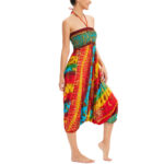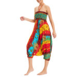 - Two Style Wear: This versatile outfit doubles as a low-cut harem pants or a strapless bandeau jumpsuit. In a way, you get 2 outfits for the price of one! The strings are on the inside of the waist, which means they can be conveniently hidden if desired. When pulled up, the strings can be put on the neck loop, but it stays up well even without them. The pants have leg elastics and a high waist elastic, both of which are very flexible and feel good against the skin.