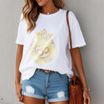 “Our design concept for this T-shirt blends traditional Buddhist elements with contemporary trends, aiming to inspire happiness and spiritual strength in those who wear it. Our goal is to create a T-shirt that not only honors Buddhist philosophy but also serves as a wearable piece of art that brings joy and a sense of connection to our community.”