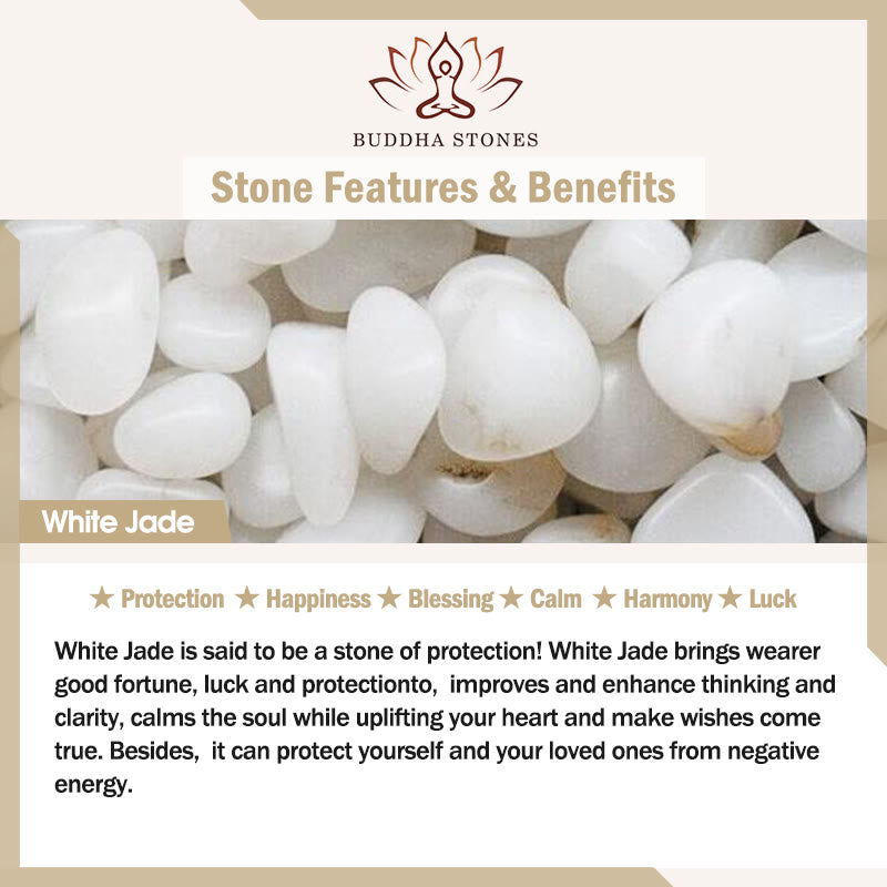 White Jade is said to be a stone of protection! White Jade brings wearer good fortune, luck and protectionto,improves and enhance thinking and clarity, calms the soul while uplifting your heart and make wishes come true.Besides, it can protect yourself and your loved ones from negative energy.